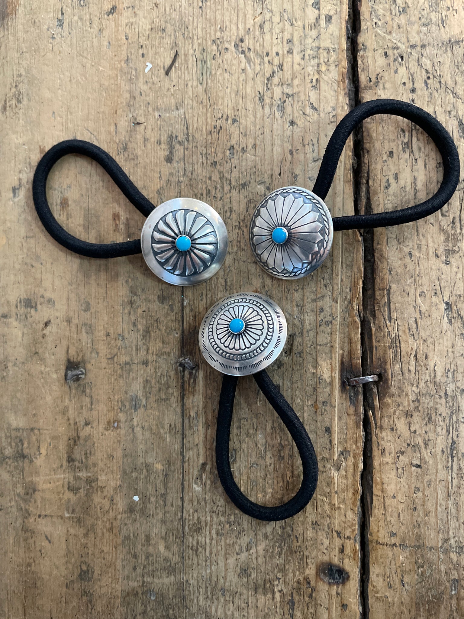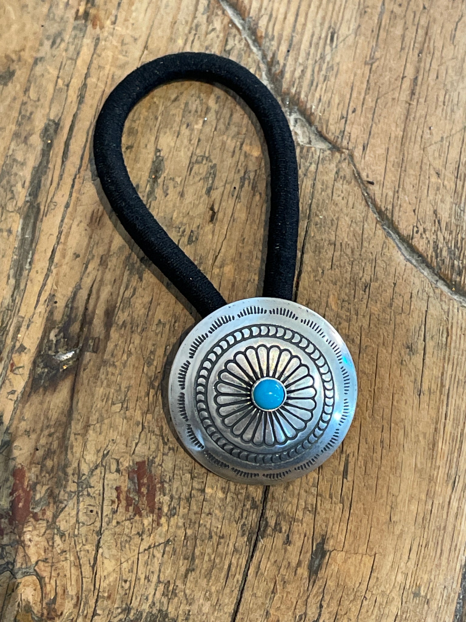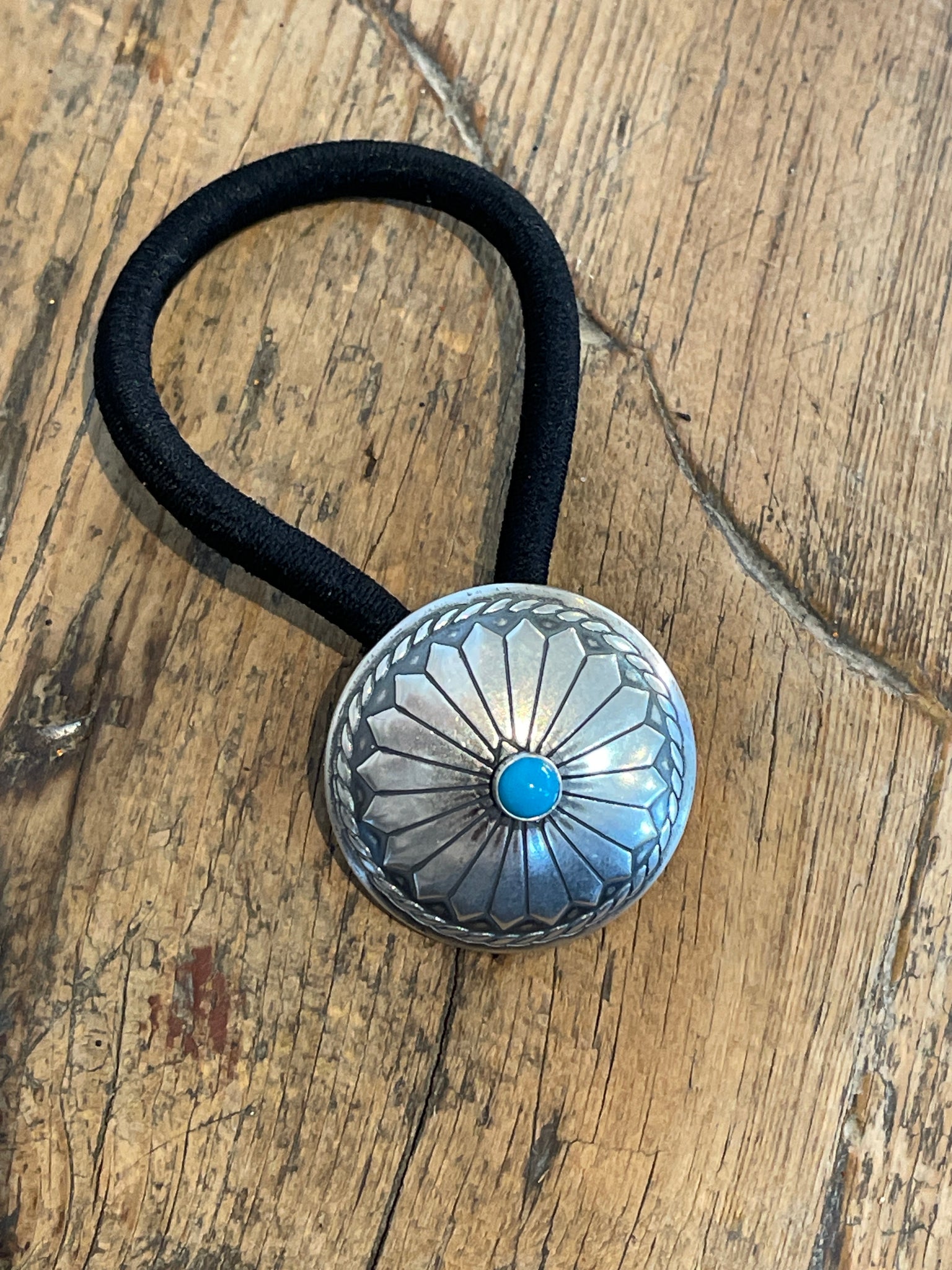 Detailed stamped Sterling Silver conch with exchangeable black hair tie - each with single turquoise center