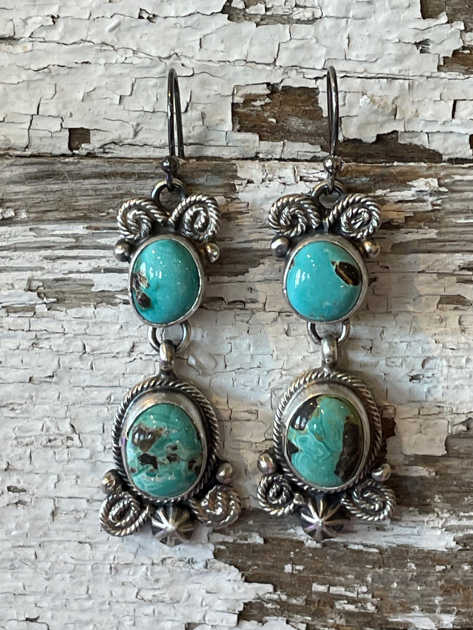 Carico Turquoise double stone earrings on sterling silver hook. 1 3/4” long